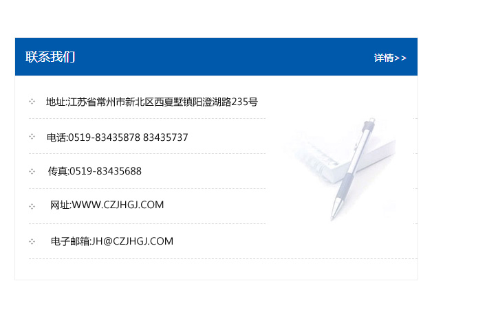 地址:常州市新北區友邦商務大廈1幢16、17層  電話:0519-85101652  傳真:0519-85112595  郵編:213022  網址:www.cz-jiayue_cn.thhuamu.com  郵箱:xiajifengaa@163.com